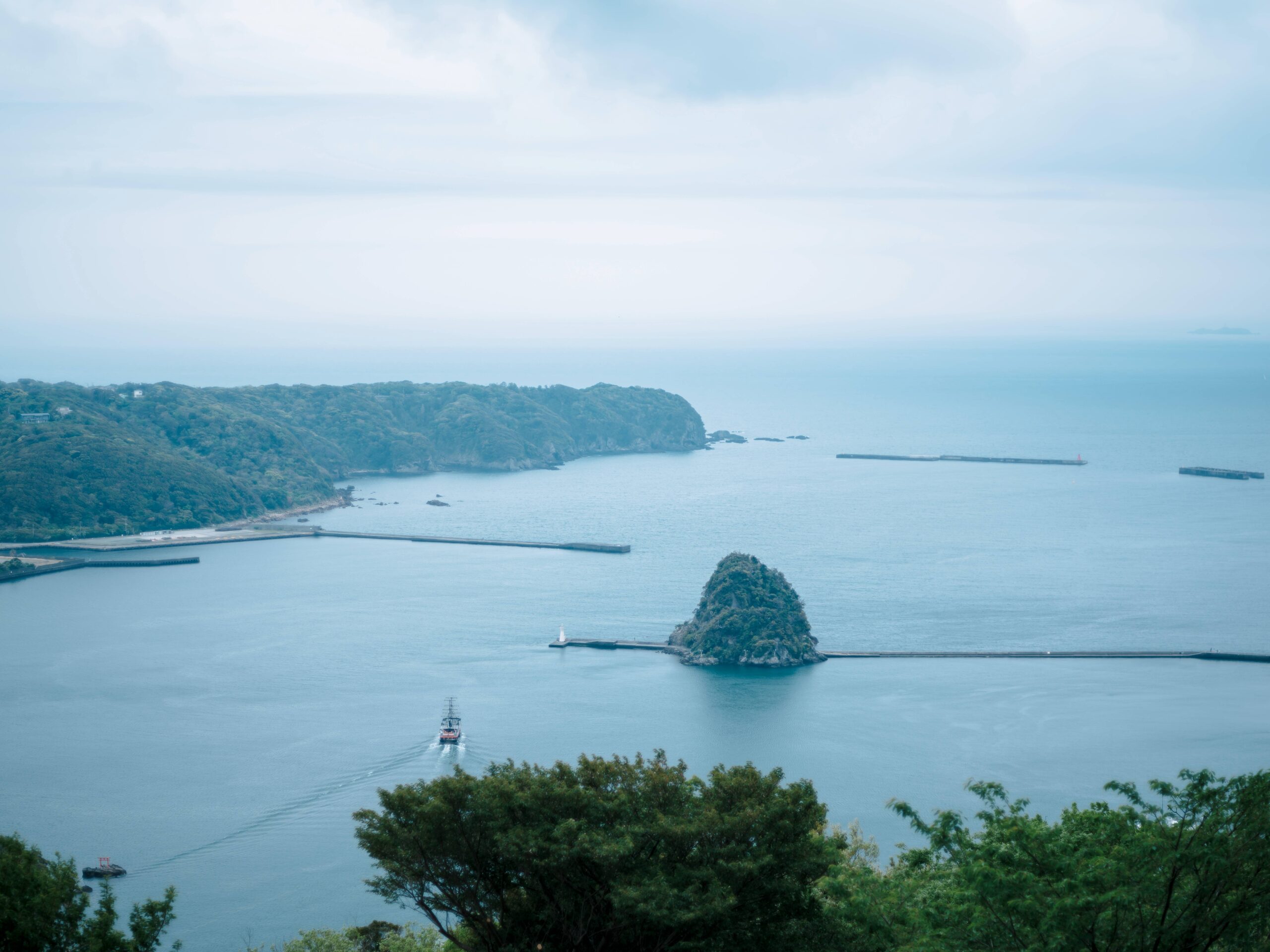 「下田港は海面がとても穏やかで、防波堤のレイアウトがどこかデザイン的。ところどころに小島がある様子は趣があるなあと思いました」