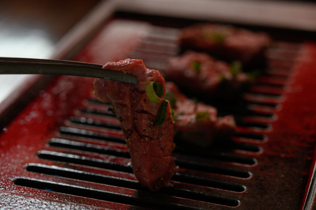 お肉のメインは黒毛和牛の牝牛。目利きの外岡さんが部位ごとに厳選して仕入れ、冷凍物は一切使っていません。外岡さんが「焼肉の聖地」ともいわれる大阪出身ゆえに、成翠園は「大阪もみダレ焼肉」を継承。「もみダレで揉んだお肉を焼き、つけダレをつけて食べていただきます。つけダレの隠し味は新鮮な果物。どちらのタレも秘伝の自家製で、自慢の味です」。